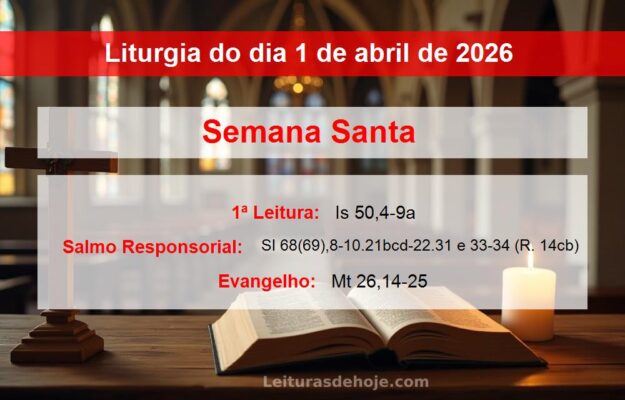 Semana Santa Primeira Leitura: Is 50,4-9a Salmo Responsorial: Sl 68(69),8-10.21bcd-22.31 e 33-34 (R. 14cb) Evangelho: Mt 26,14-25 Cor Litúrgica: Roxo 31 março 01 abril 02 abril Evangelho e leituras de hoje – 1 de abril de 2026 Primeira Leitura Salmo Responsorial Evangelho Homilia Reflexão Santo do Dia A Liturgia do Dia é um presente diário [...]