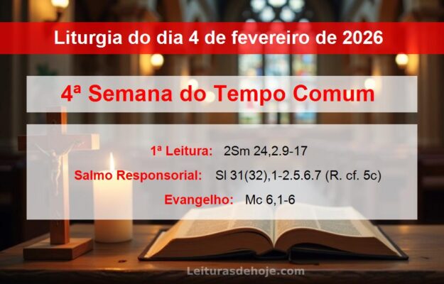 4ª Semana do Tempo Comum Primeira Leitura: 2Sm 24,2.9-17 Salmo Responsorial: Sl 31(32),1-2.5.6.7 (R. cf. 5c) Evangelho: Mc 6,1-6 Cor Litúrgica: Verde 03 fevereiro 04 fevereiro 05 fevereiro Evangelho e leituras de hoje – 4 de fevereiro de 2026 Primeira Leitura Salmo Responsorial Evangelho Homilia Reflexão Santo do Dia A Liturgia do Dia é um [...]